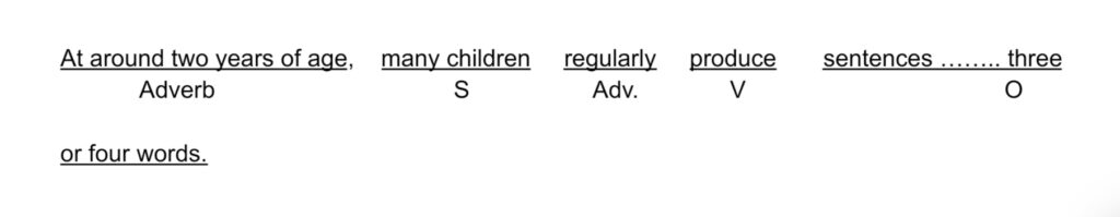 28. At around two years of age, many children regularly produce sentences _____ three or four words.